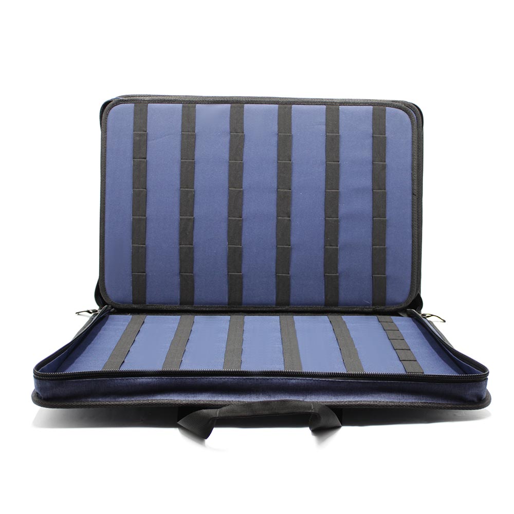 Медицинская папка-органайзер для набора вкладок. Вместительная папка-органайзер предназначена для систематизации и демонстрации мелких комплектующих или набора небольших деталек. Папка выполнена в форме демонстрационного портфеля-книжки, при открытии обеспечивается удобный доступ ко всем принадлежностям. Сама папка и вкладные элементы выполнены из прочного и формуустойчевого платика, при этом сохраняя лёгкость . Папака закрывается на молнию. В верхней части изделия расположена ручка для удобной переноски. Внутри папки имеется набор вкладок, выполненные из жёсткого материла, на которых расположены комбинации карманов и резинок для организации, хранения и демонстрации любого набора деталей или небольших вещей. Комбинация и форма карманов, а также их размер подбирается индивидуально согласно назначению и технического задания от заказчика. На передней панеле портфеля расположен объёмный вместительный карман для бумаг, на котором имеется логотип компании изготовленный вышивкой.